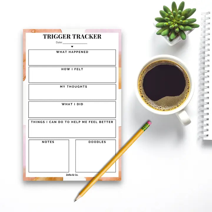 The Mental Health Trigger Tracker Notepad is designed to improve emotional well-being by helping you track your triggers, feelings, thoughts, and actions. Rooted in Cognitive Behavioral Therapy (CBT), this notepad encourages self-reflection, allowing you to better understand your emotional patterns and move past challenging moments.